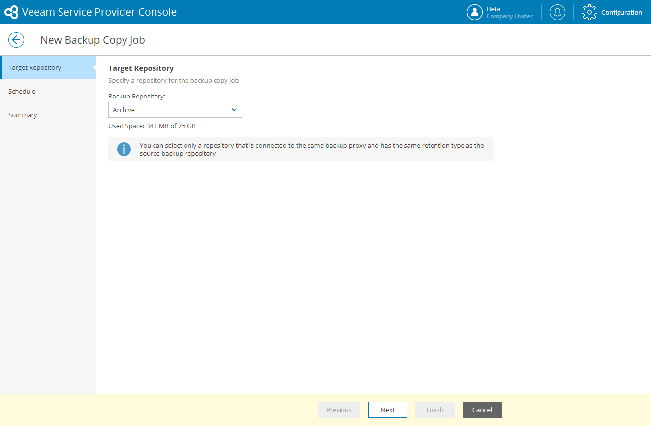 At the Target Repositpry step of the wizard, select target backup repository from the list.