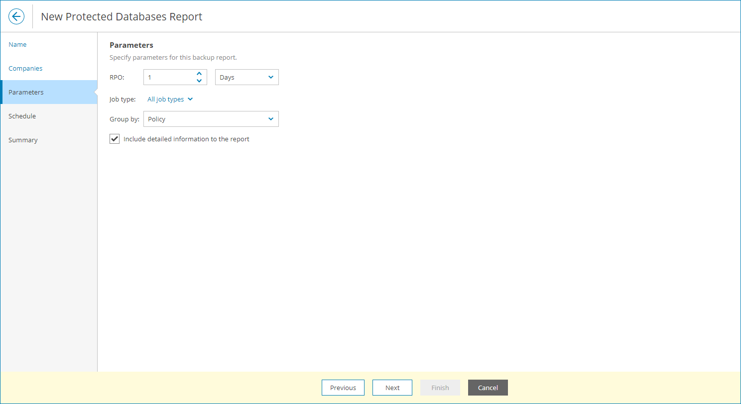 - In the Group by list, choose how analyzed data must be grouped in the report (by Policy, Backup server or Platform type).