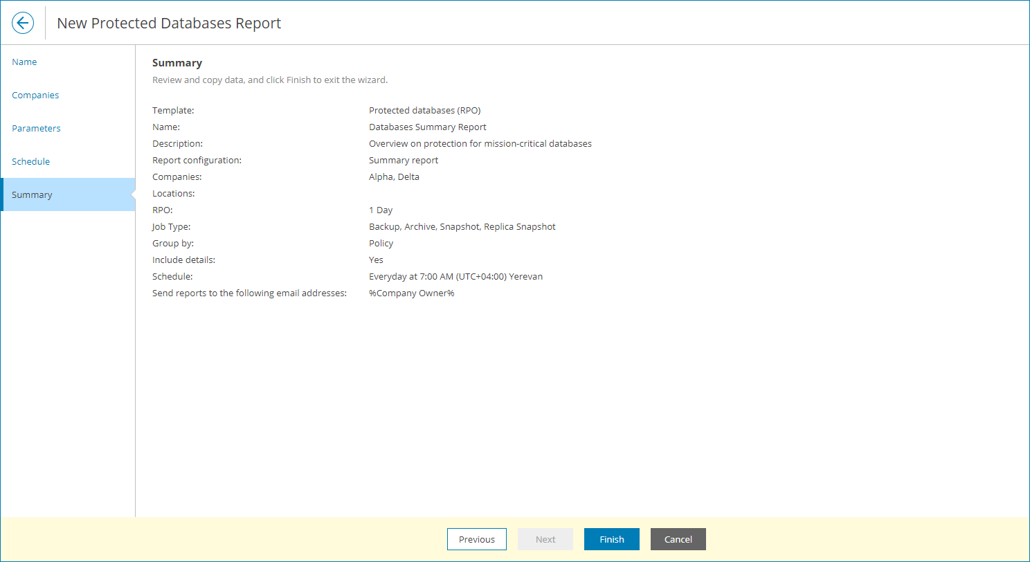 - At the Summary step of the wizard, review the report configuration and click Finish.