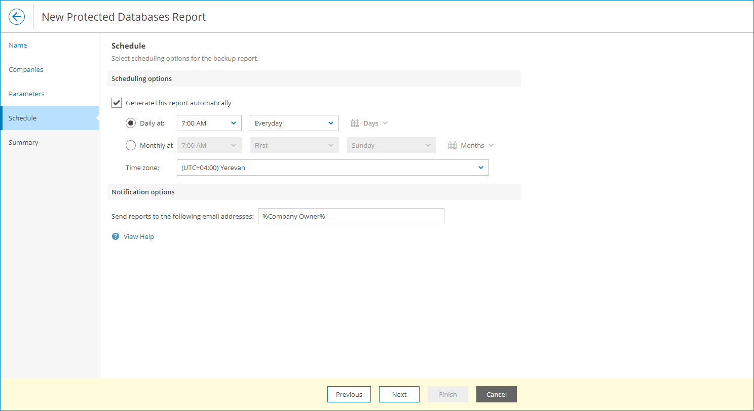 - At the Schedule step of the wizard, specify a schedule according to which the report must be generated: