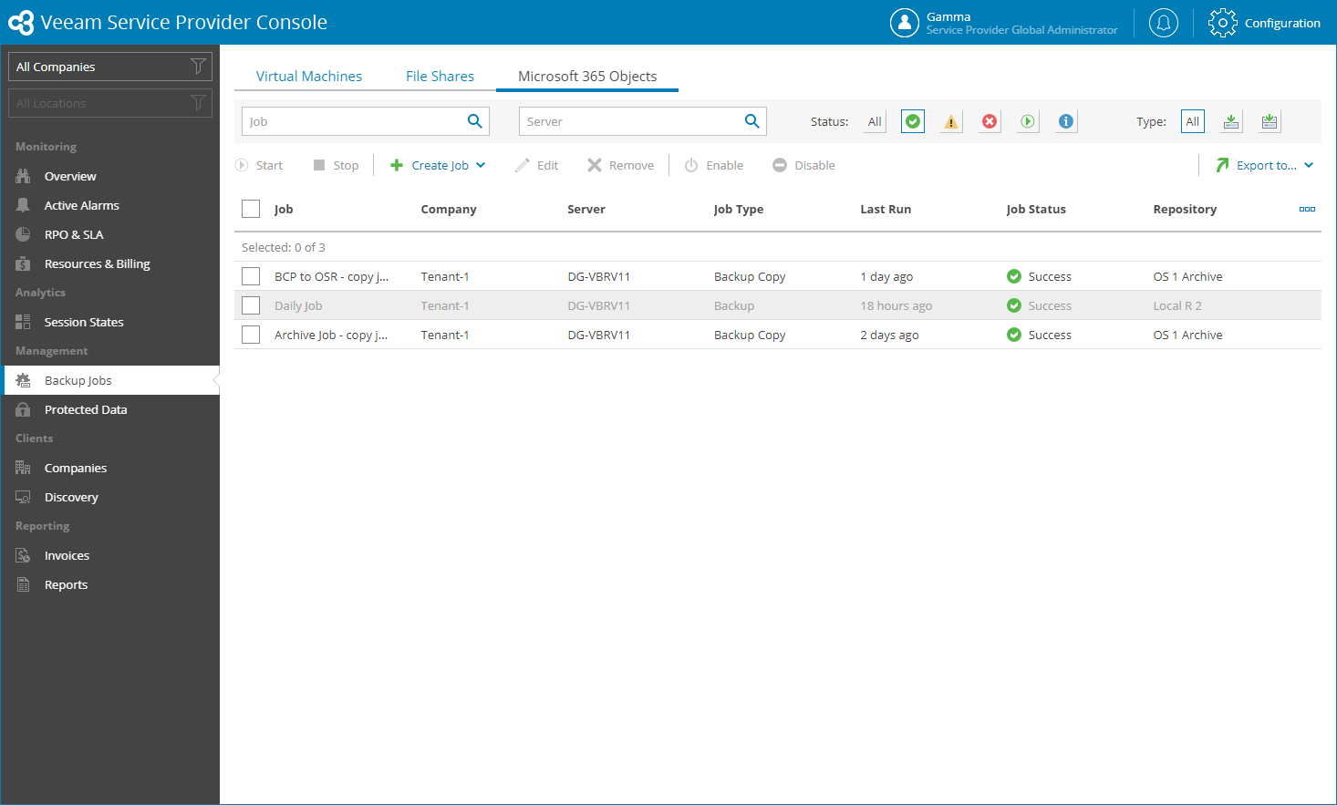 - Company/Location — limit the list of jobs by company and location to which jobs belong. To limit the list of jobs by company and location, use filters at the top left corner of the Veeam Service Provider Console window.