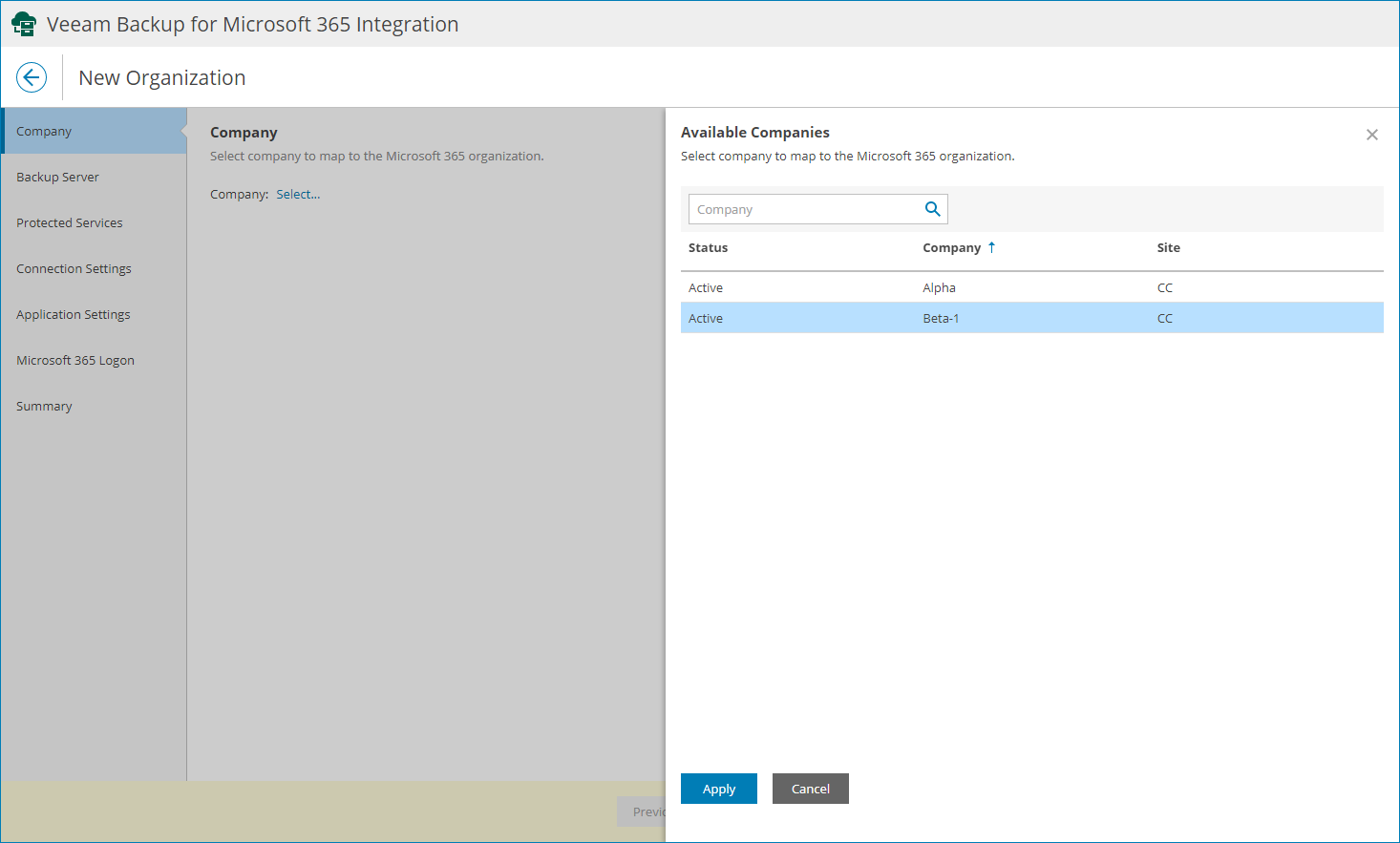 - At the Company step of the wizard, select company to which you want to map the organization.