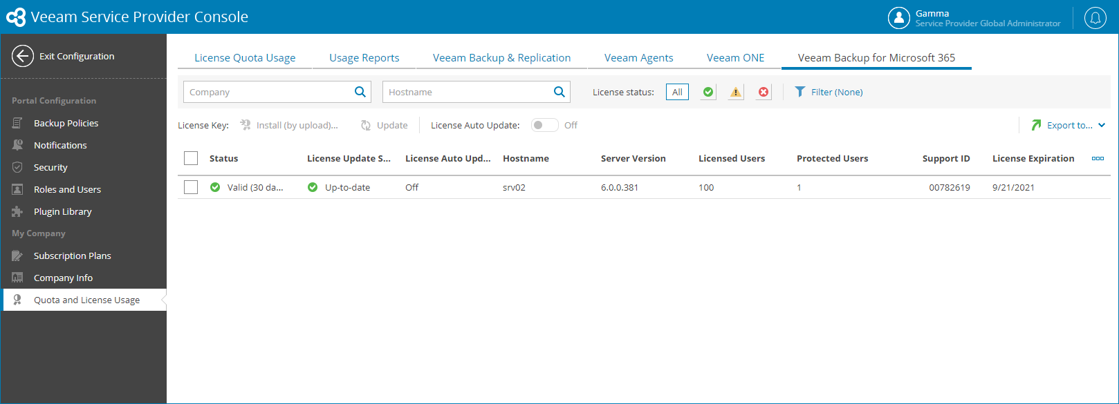 - Hostname — name of a Veeam Backup for Microsoft 365 server for which license details are provided.