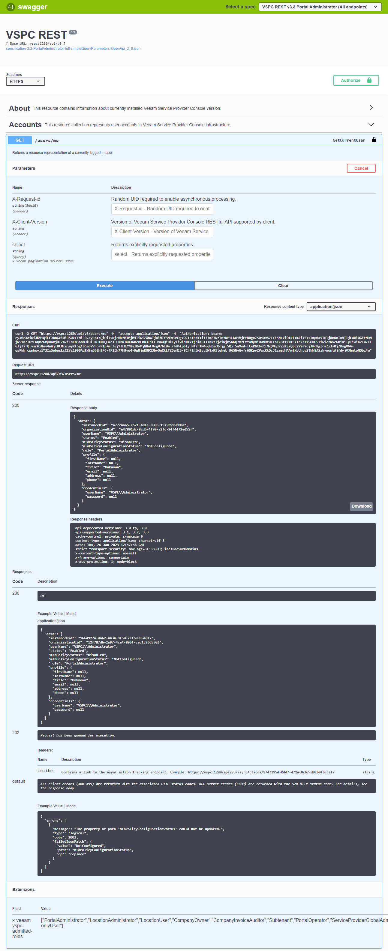 After you get and validate an access token, you can send HTTPS requests to the Veeam Service Provider Console REST API collections and resources in Swagger UI.