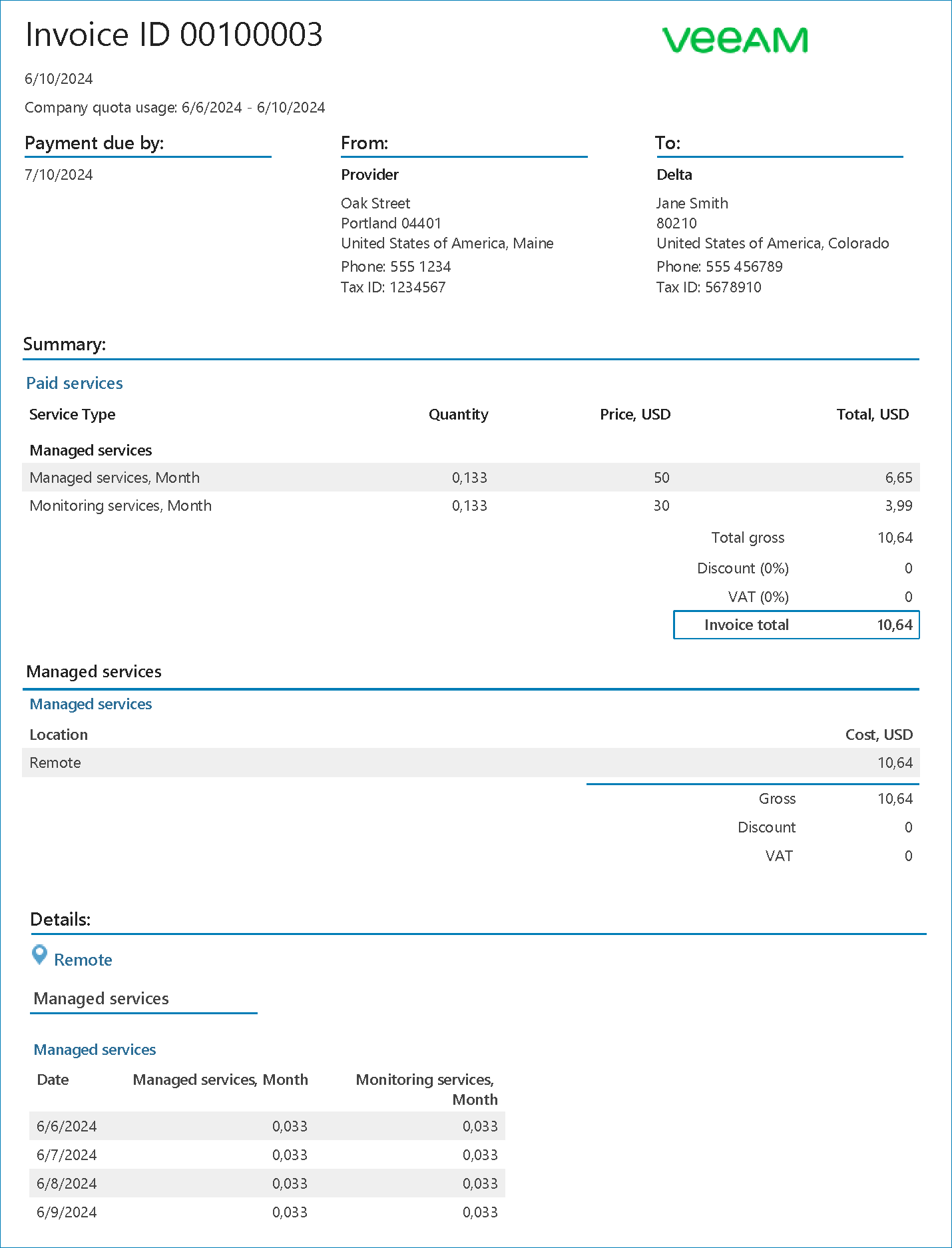 You can generate an invoice in the Veeam Service Provider Console to calculate the cost of services provided to a company. The invoice provides information about the cost of consumed services in accordance with a subscription plan assigned to a company.