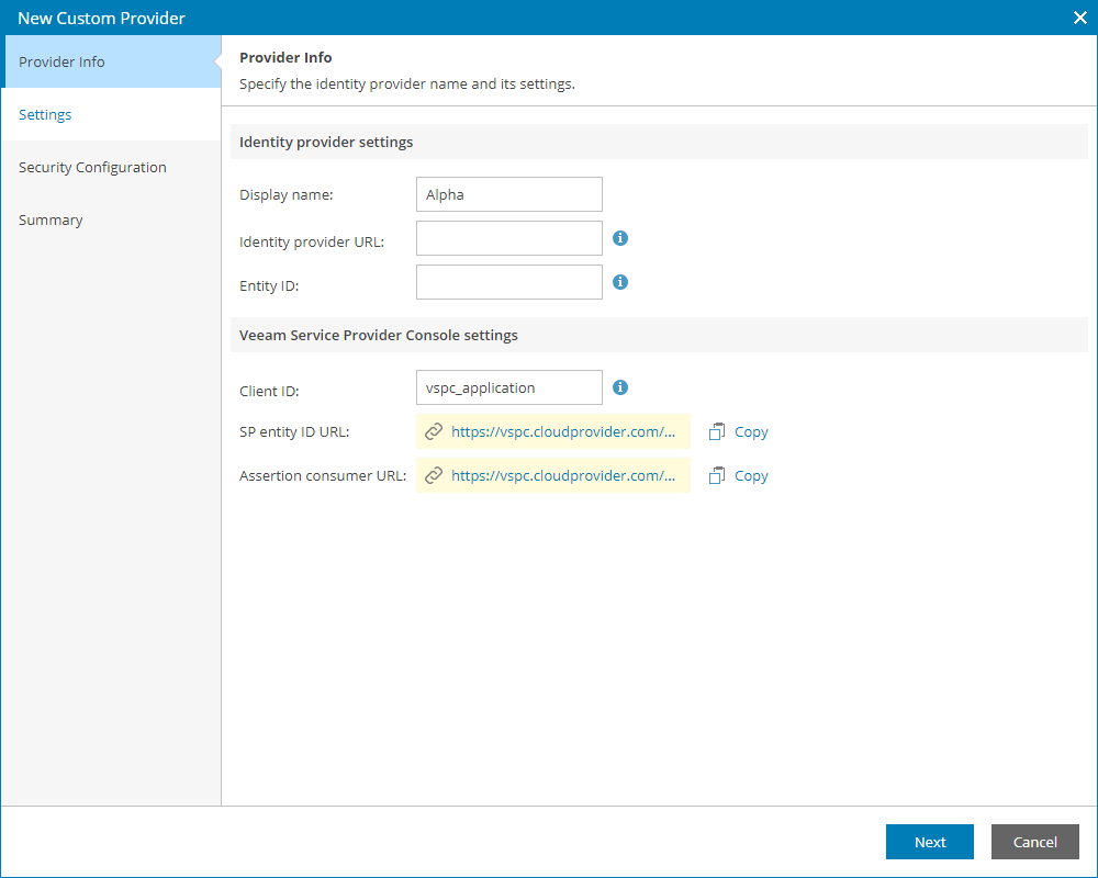 1. In Veeam Service Provider Console, specify general information on the IdP: