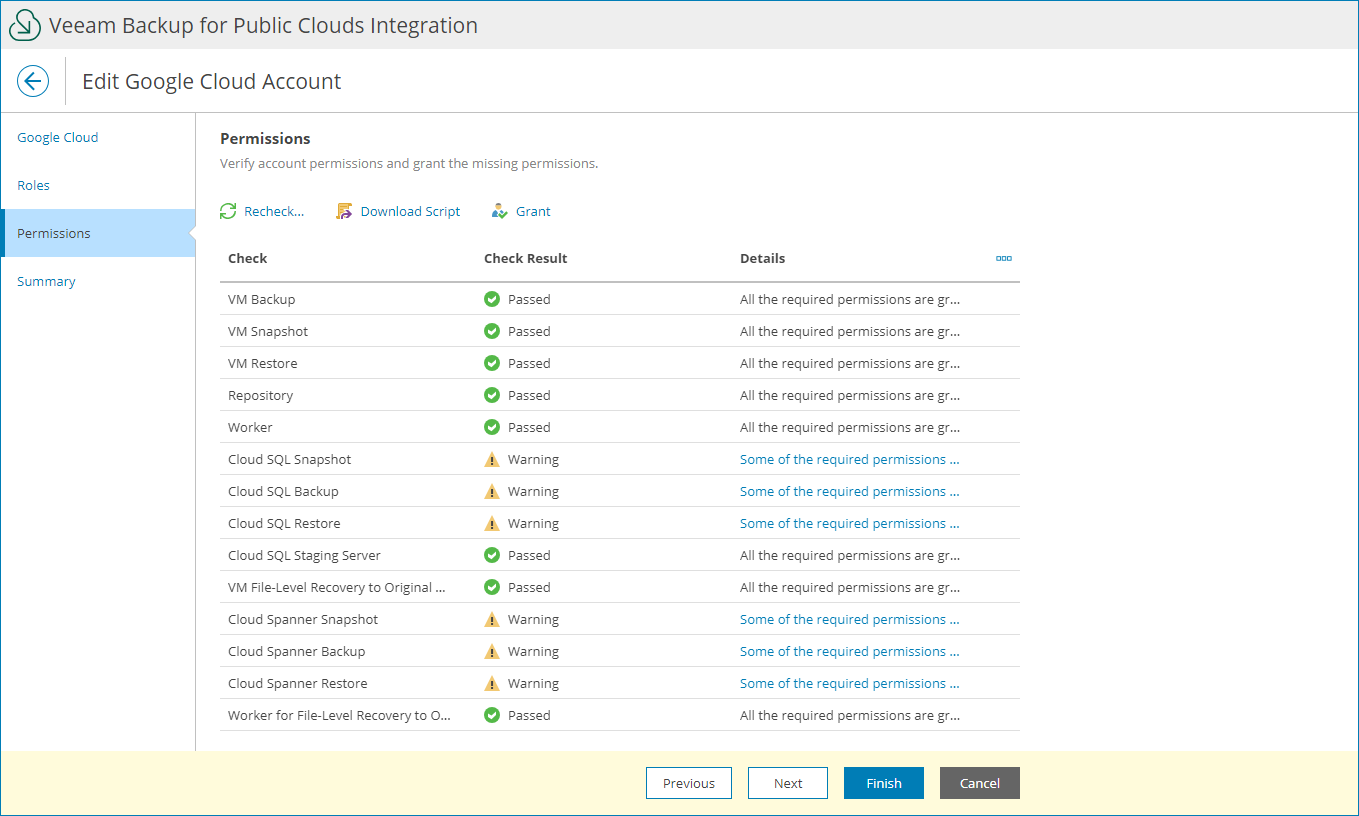 To make sure that the missing permissions have been granted successfully, click Recheck.