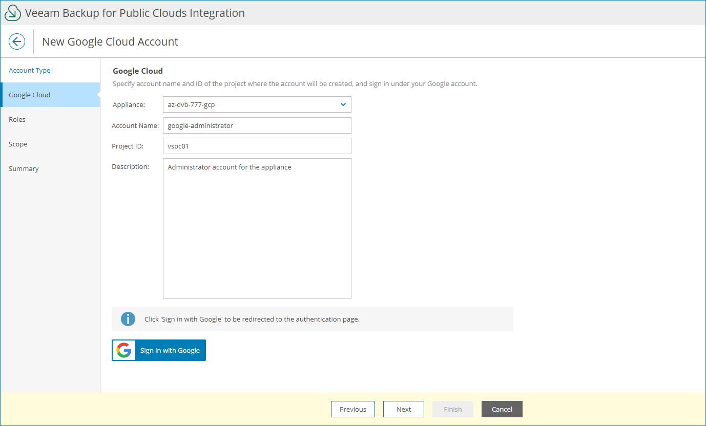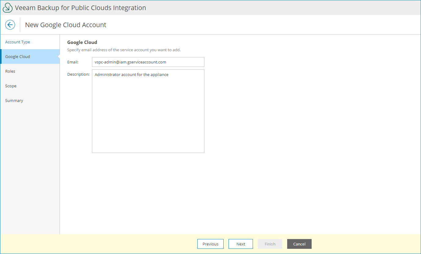 Veeam Service Provider Console will open the New Google Cloud Account wizard.