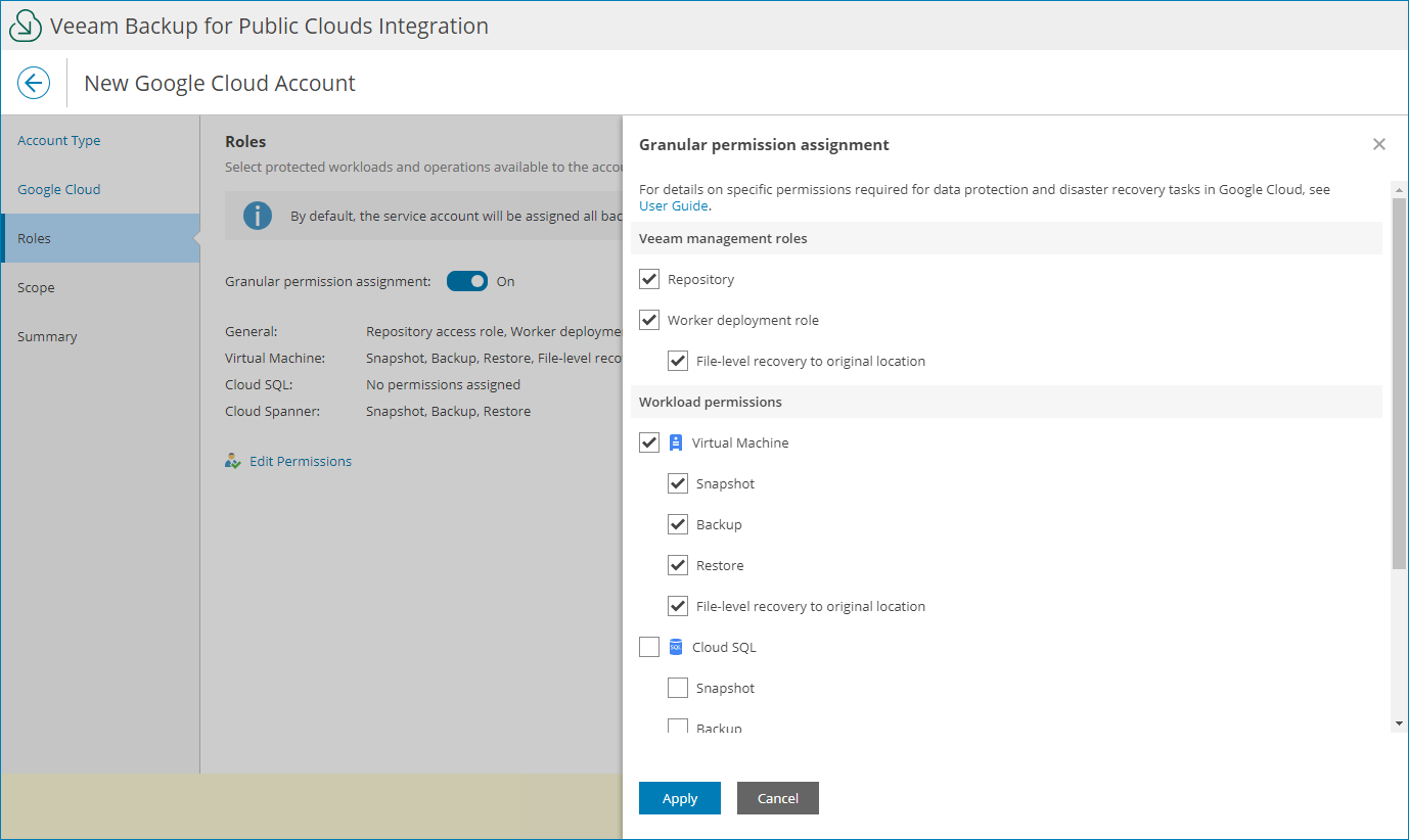 - By default, the service account is assigned all roles and permissions for all types of protected workloads. If necessary, at the Roles step of the wizard you can define operations that the account will be able to perform for the managed workloads: