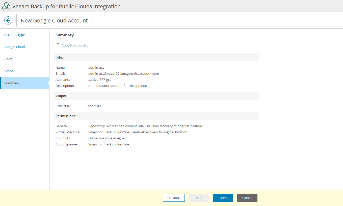 - Repository access role — permissions of this account role will be used to create new repositories in target Google Cloud buckets and to access the repositories during data protection and disaster recovery operations.