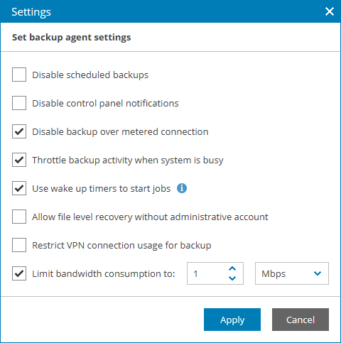 - Disable backup over metered connection — select this option if you want to disable backup over metered Internet connection to avoid extra costs. Veeam backup agents can automatically detect metered connections. If this option is enabled, Veeam backup agents will not perform backup when the endpoint is on such connection. For details, see section Disabling Backup over Metered Connections of the Veeam Agent for Microsoft Windows User Guide.