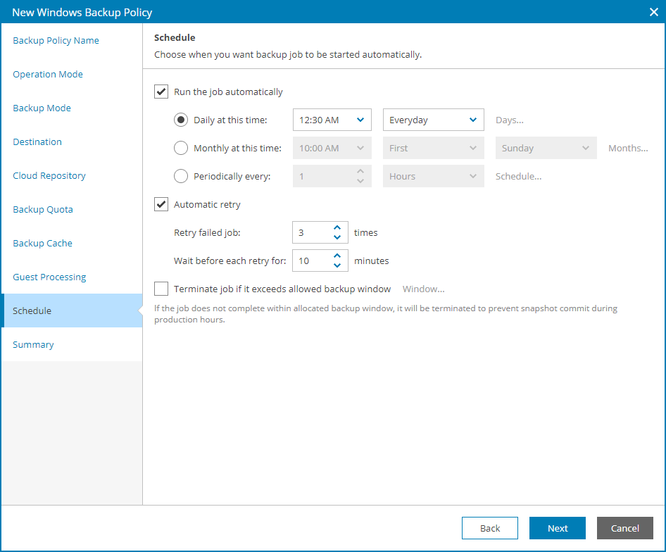 - Select the Terminate job if it exceeds allowed backup window check box and click Window.