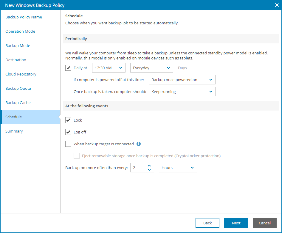 - Backup once powered on — select this option if Veeam backup agent must start the scheduled backup job when you power on the computer.