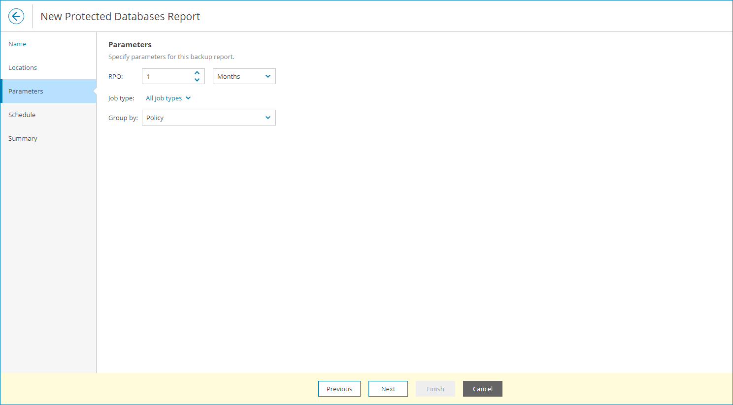 - In the Group by list, choose how analyzed data must be grouped in the report (by Policy, Backup server or Platform type).