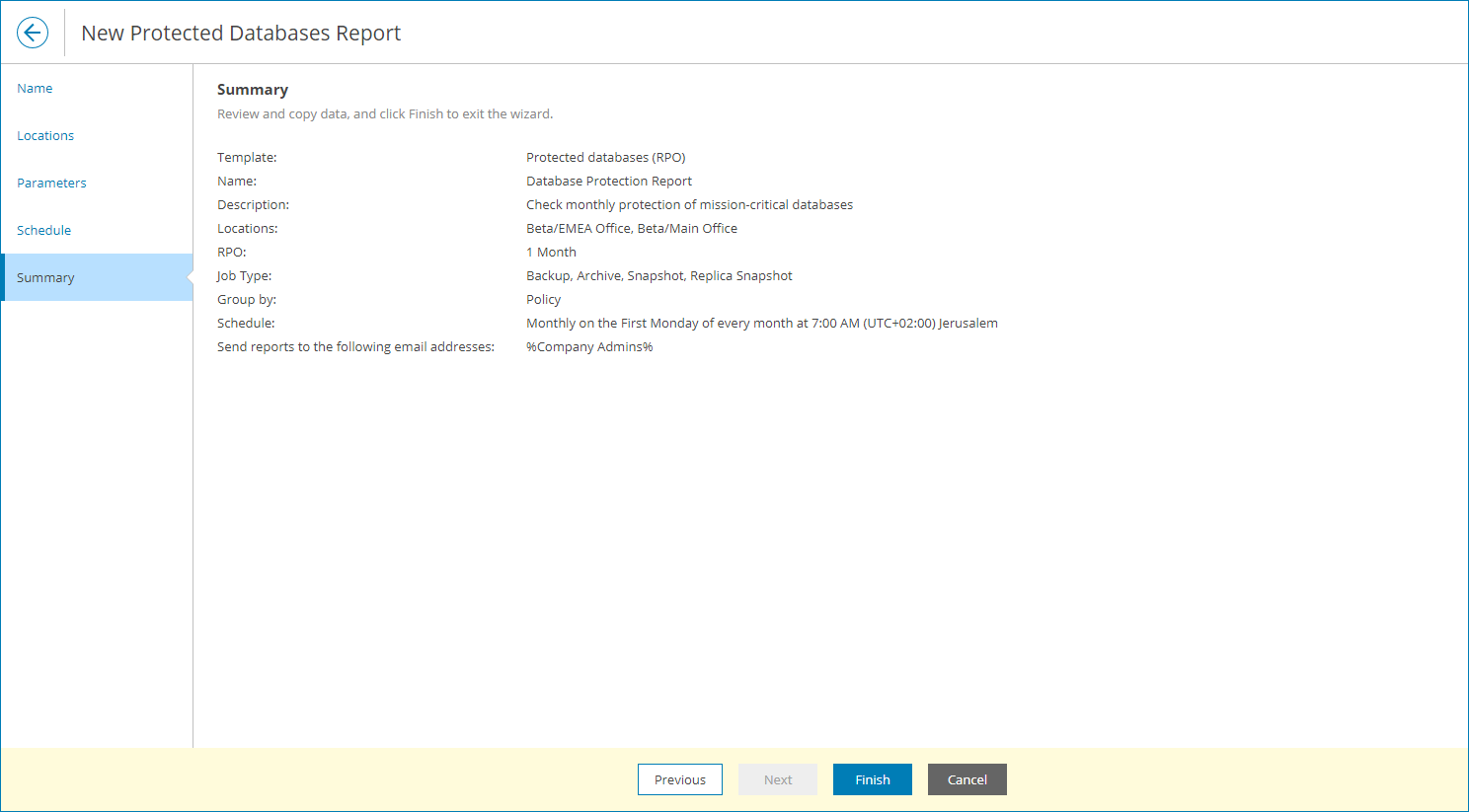 - At the Summary step of the wizard, review the report configuration and click Finish.