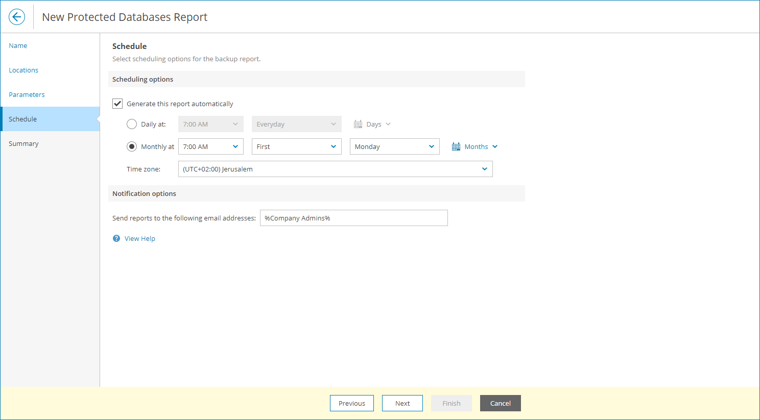 - At the Schedule step of the wizard, specify a schedule according to which the report must be generated: