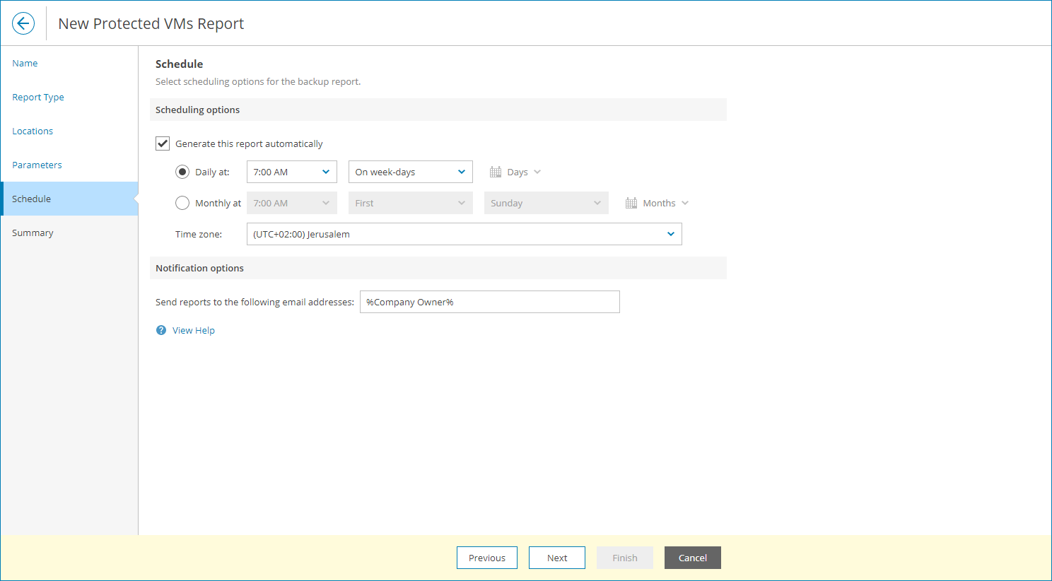 - At the Schedule step of the wizard, specify a schedule according to which the report must be generated: