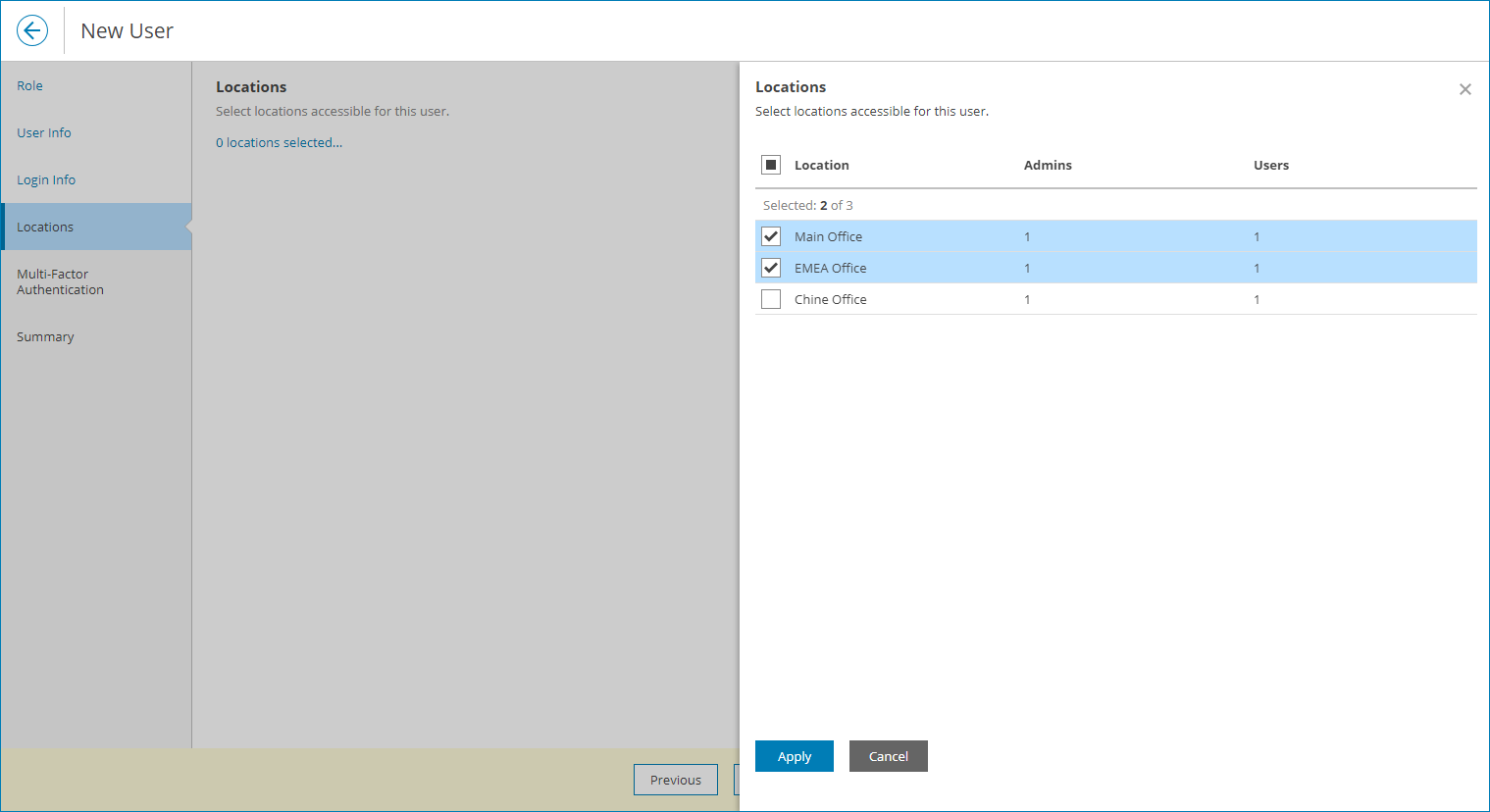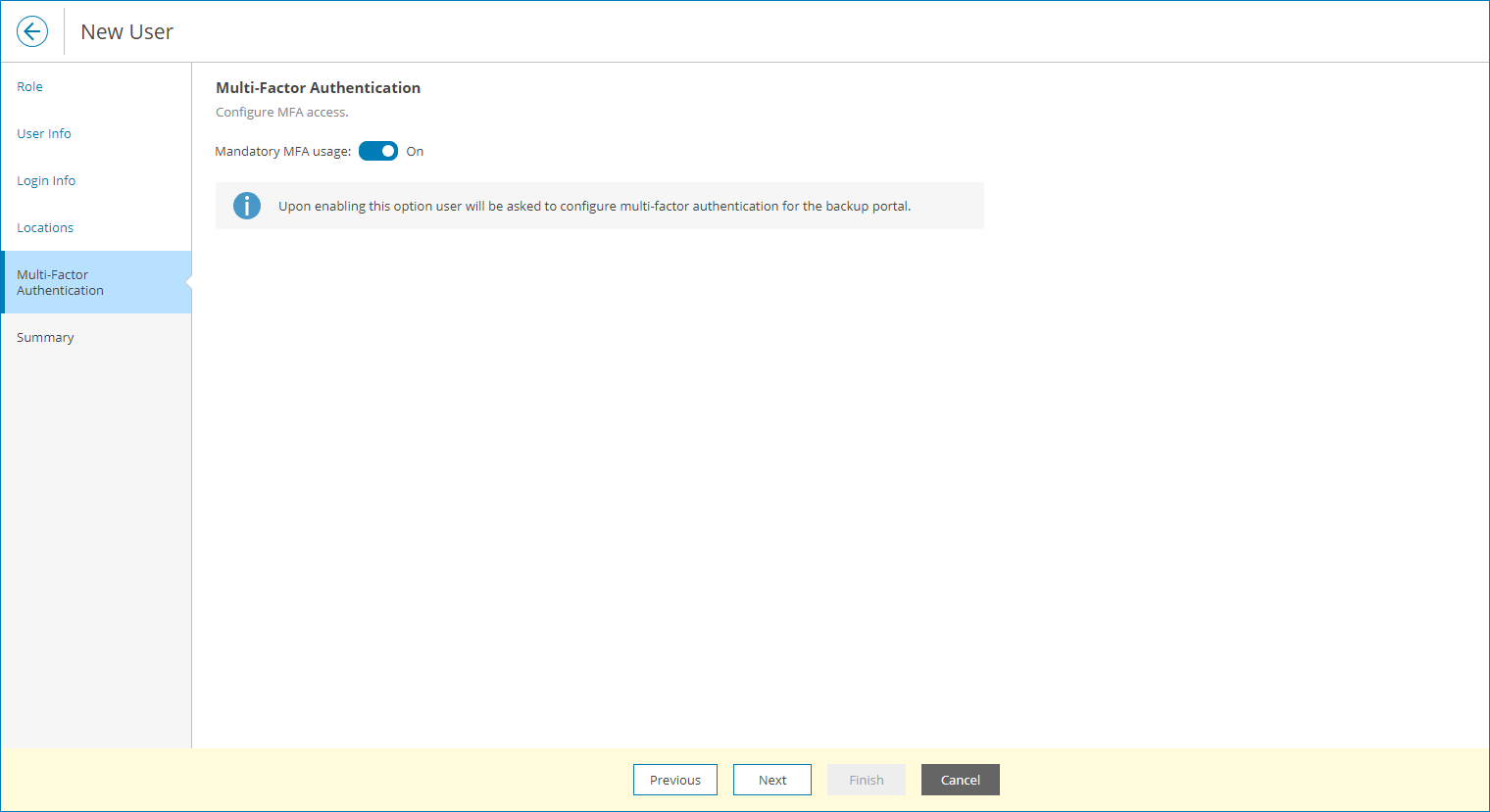 - At the Multi-Factor Authentication step of the wizard you can assign a second authentication factor to the new user. For details on MFA, see Configuring Multi-Factor Authentication.