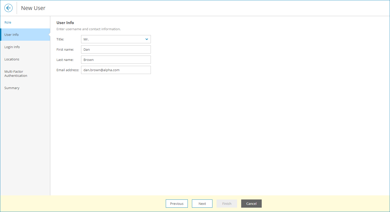 - At the User Info step of the wizard, specify user's title, first name, last name and email address.