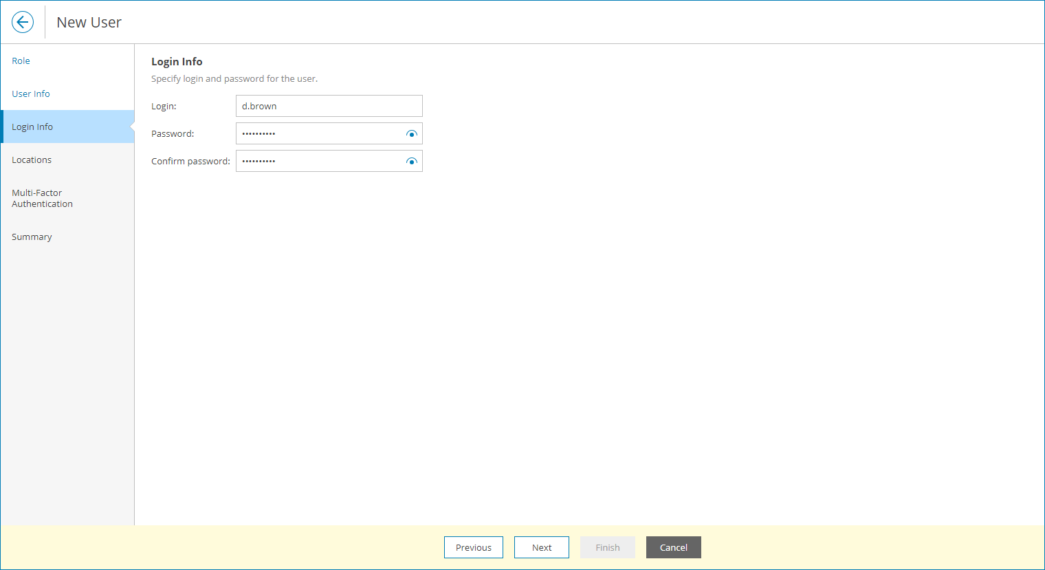 - At the Login Info step of the wizard, in the Username, Password and Confirm Password fields, type a user name and password.