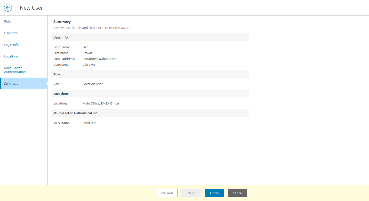- At the Multi-Factor Authentication step of the wizard you can assign a second authentication factor to the new user. For details on MFA, see Configuring Multi-Factor Authentication.