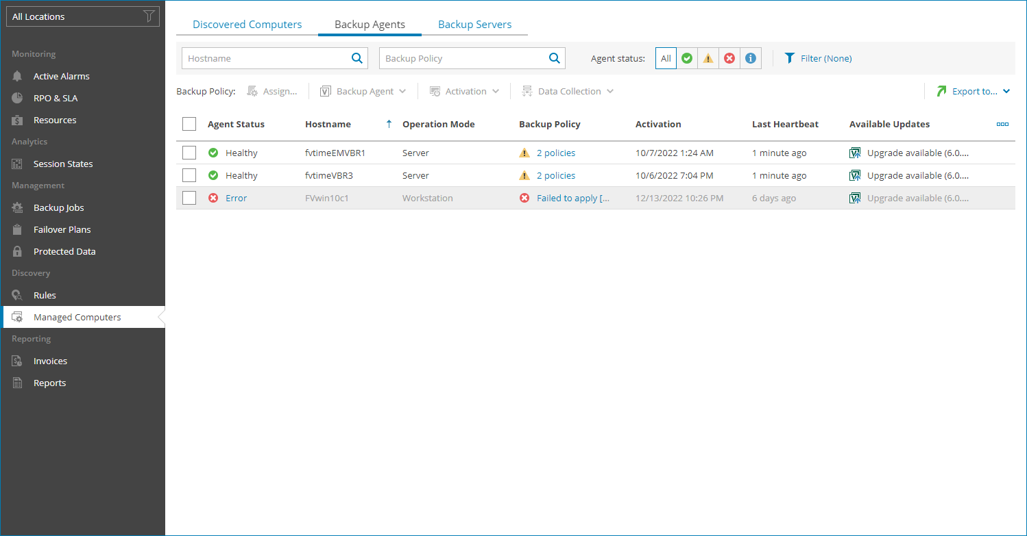 - Available Updates — update status of Veeam backup agent deployed on a managed computer (Up-to-date, Upgrade available, Patch available, Manual upgrade required).