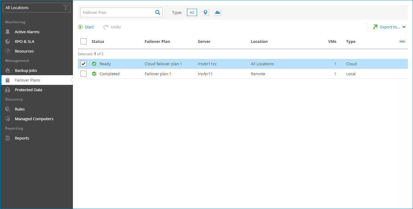 - Type — limit the list of failover plans by type (Local, Cloud).
