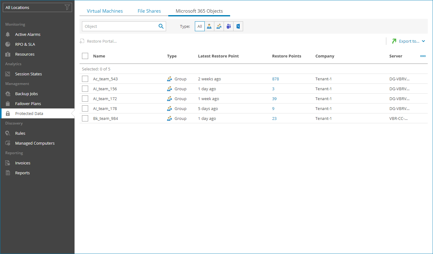 Veeam Service Provider Console will display a list of all objects protected by managed Veeam Backup for Microsoft 365.