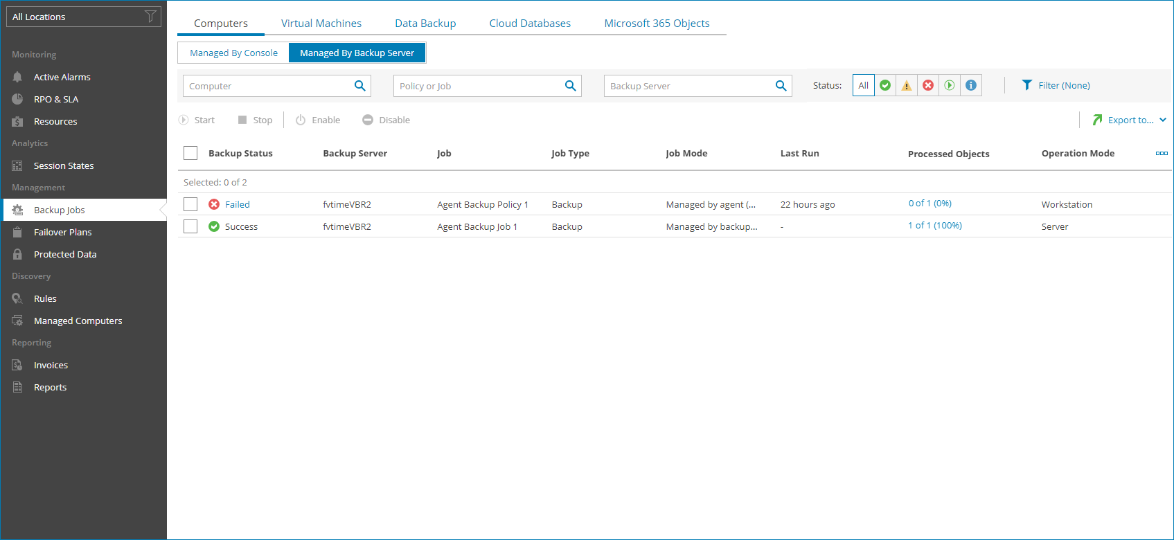 - Job Type — type of Veeam backup agent data protection job (Backup, Backup copy, SureBackup).