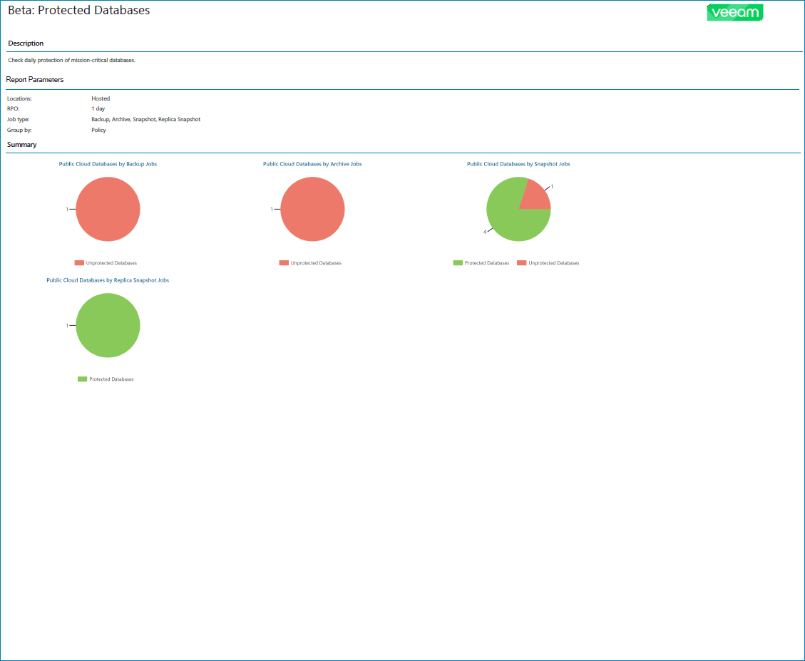- The report charts display information about the number of databases protected with backup jobs, archive backup jobs, snapshots and replica snapshots.
