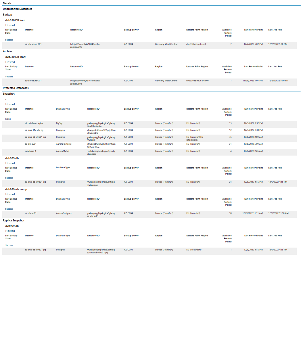 - The Details section provides information about all protected and unprotected databases including instance name, region and resource ID, database type, backup server name, restore point region, number of available restore points and date and time of the latest restore point and job run.