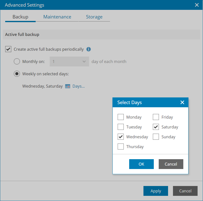 If you want to periodically create active full backups, on the Backup tab of the Advanced Settings window, select the Create active full backups periodically check box. Use the Monthly on or Weekly on selected days options to define scheduling settings.