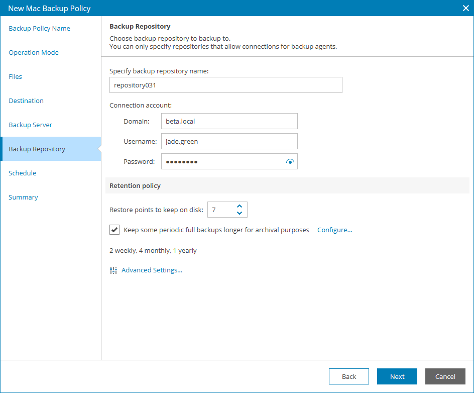 Permissions on the backup repository managed by the target Veeam backup server must be granted beforehand. For details, see section Setting Up User Permissions on Backup Repositories of the Veeam Agent for Mac User Guide.