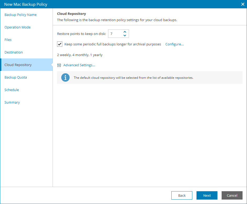 The policy will target to the default repository specified by your service provider. If you want to store backups on another backup repository, you can choose this repository in backup job settings for specific computers. For details, see Configuring Backup Job Settings for Individual Computers. |