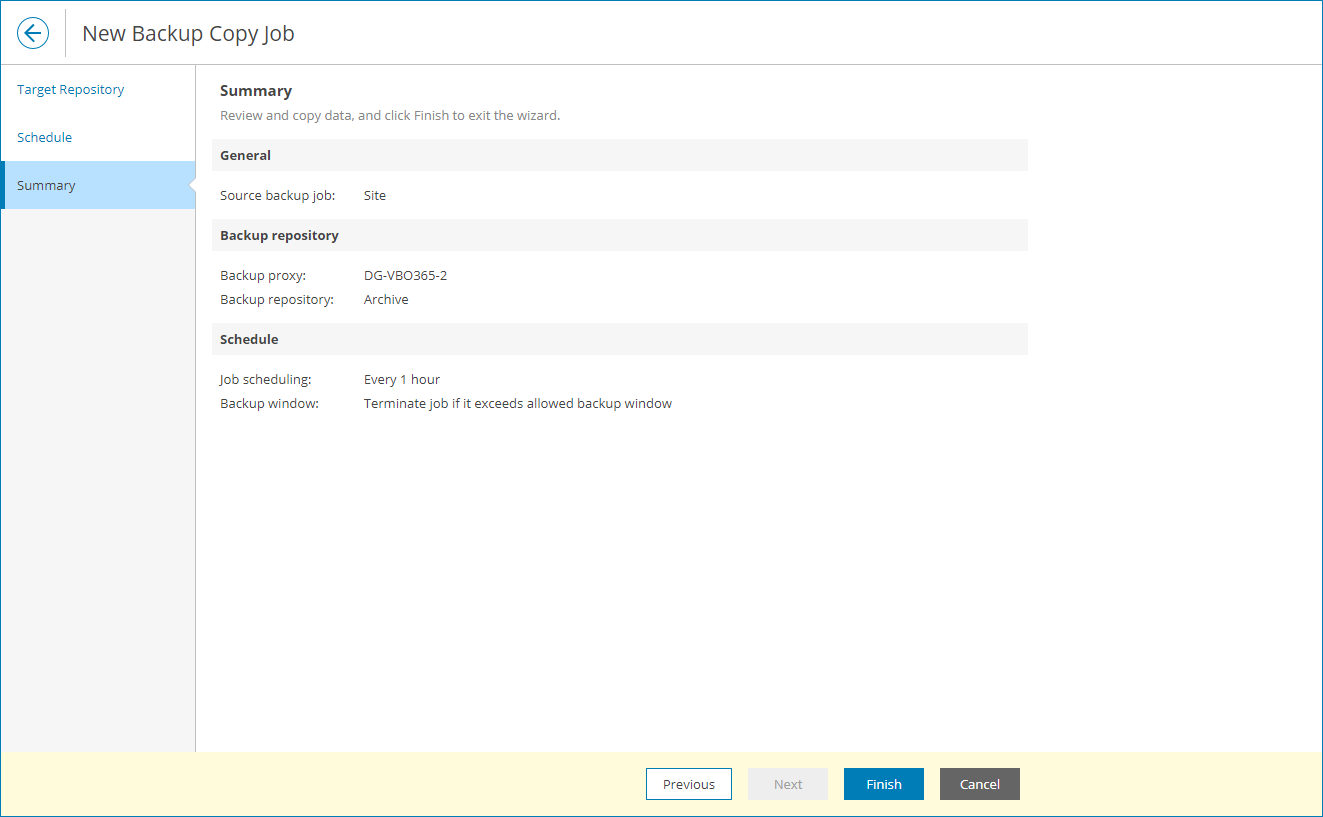 This is an archive version of the document. To get the most up-to-date information, see the current version. Step 4. Review Backup Copy Job Settings At the Summary step of the wizard, review the configured backup copy job settings and click Finish.