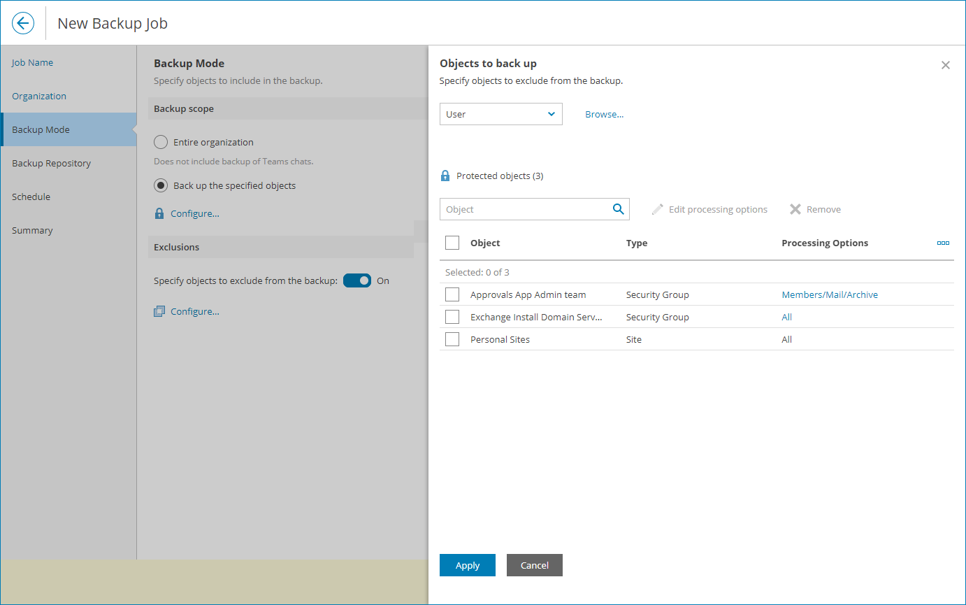 For details about available object types and their processing options, see section Organization Object Types of the Veeam Backup for Microsoft 365 User Guide.
