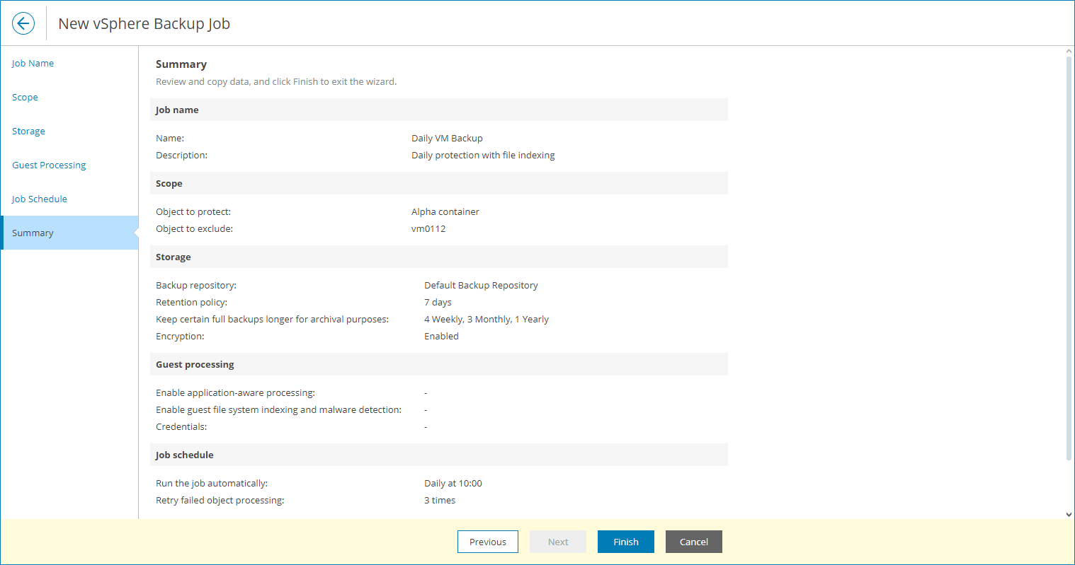 At the Summary step of the wizard, review configured backup job settings and click Finish.