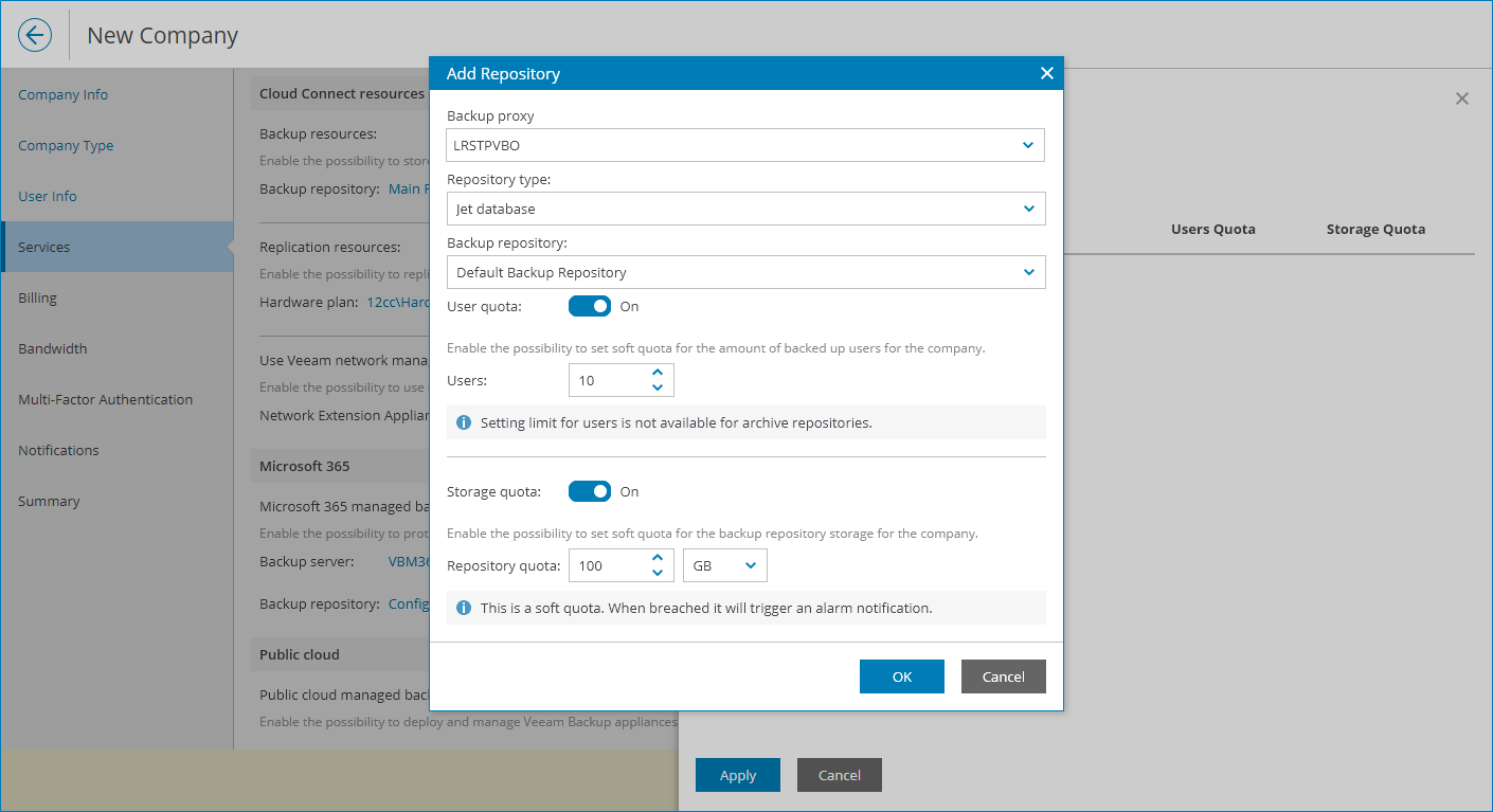 - If you want to limit the number of users for object storage or Jet database repositories, set the User quota toggle to On and specify the maximum number of users that the company is allowed to store on the repository in the Users field.