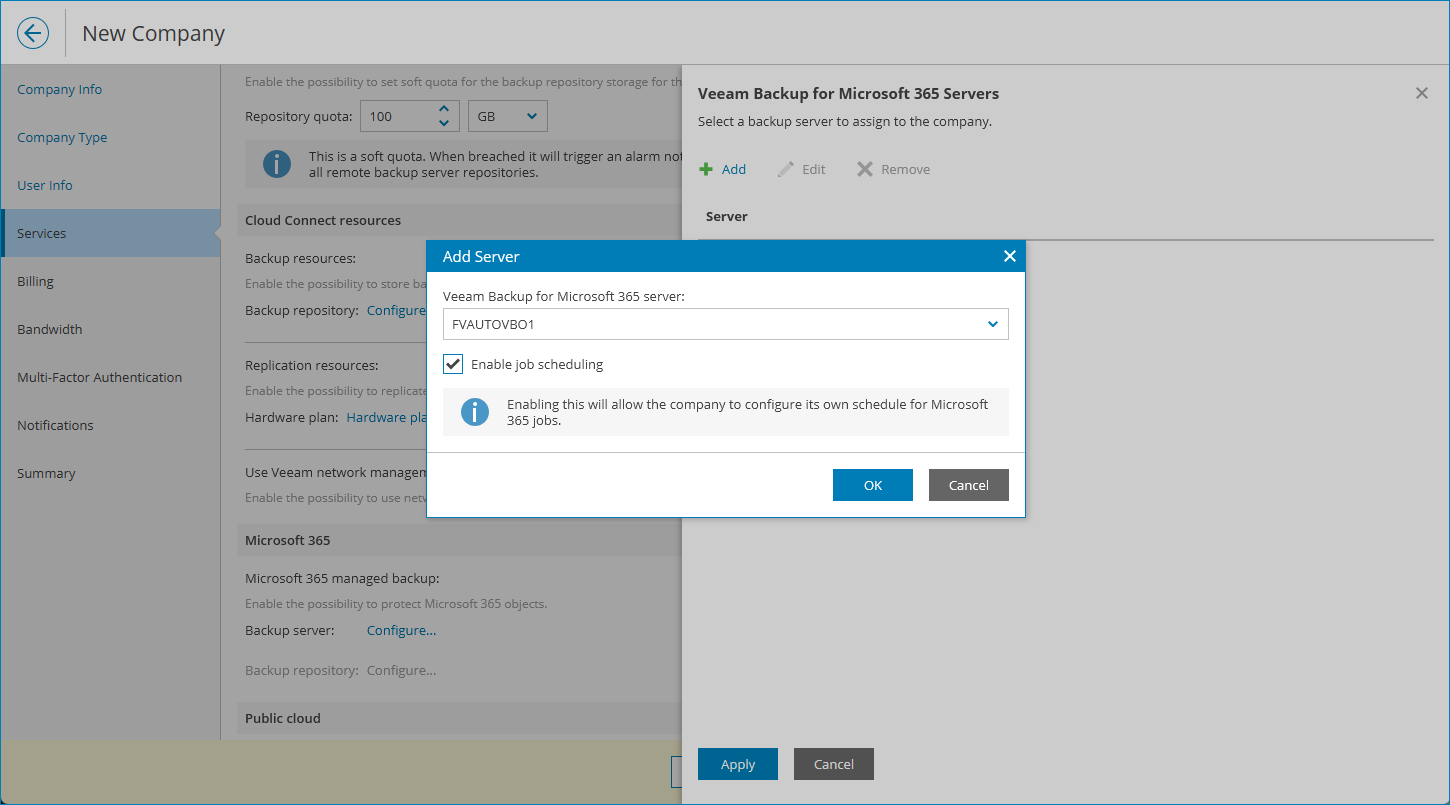 - To allow a company to schedule backup jobs configured on hosted Veeam Backup for Microsoft 365 server, select the Enable job scheduling check box.