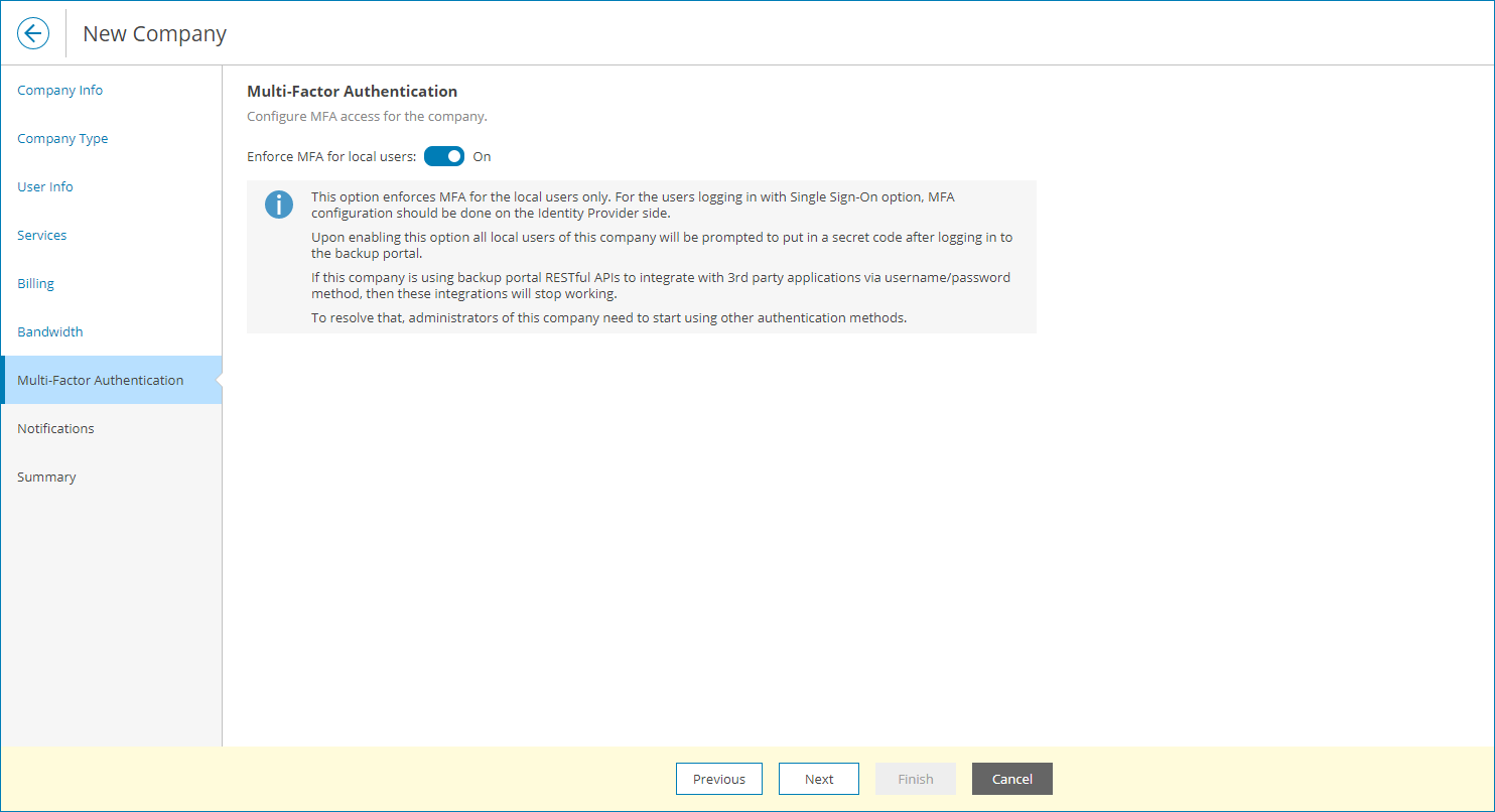 At the Multi-Factor Authentication step of the wizard you can assign a second authentication factor to all company users. For details on MFA, see Configuring Multi-Factor Authentication.
