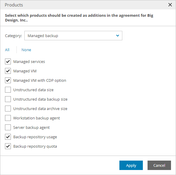 - In the Products window, for each service group from the Category drop-down list, select products that you want to add to agreements.