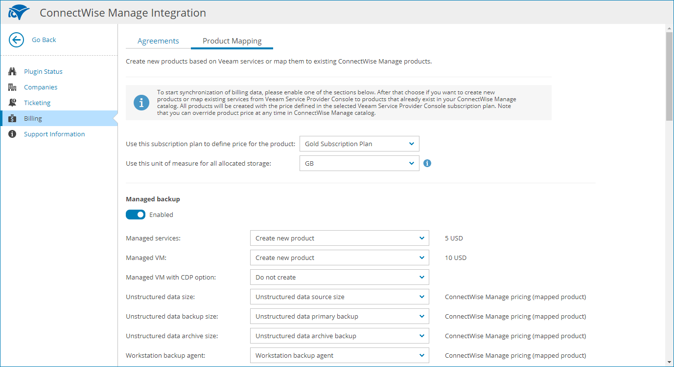 Veeam Service Provider Console will create additions for the selected products to company agreements and start sending information about the quantity of consumed services to ConnectWise Manage.