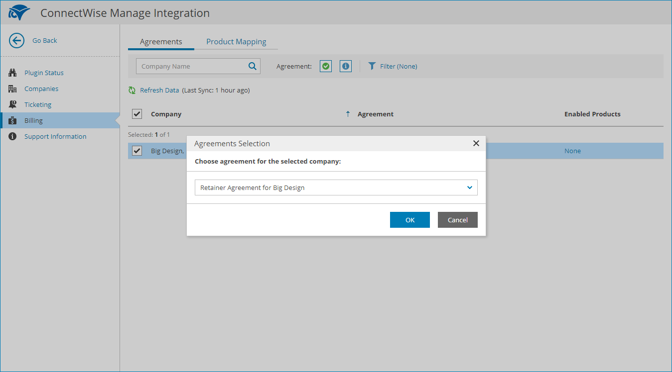 For every mapped company, select an agreement which ConnectWise Manage will use to generate invoices.