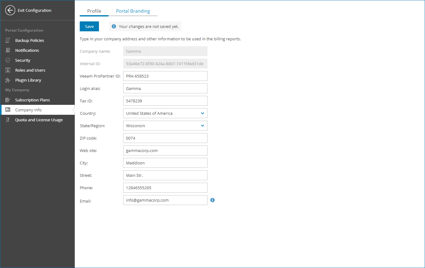 Before you start working with Veeam Service Provider Console, you must fill out the reseller profile. The profile contains information about your company, such as the company name, address, contact person details and so on. Information specified in the reseller profile is included in invoices, backup reports and email notifications.