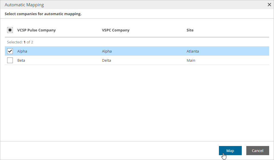 - In the displayed list of matched companies, select the necessary companies and click Map.