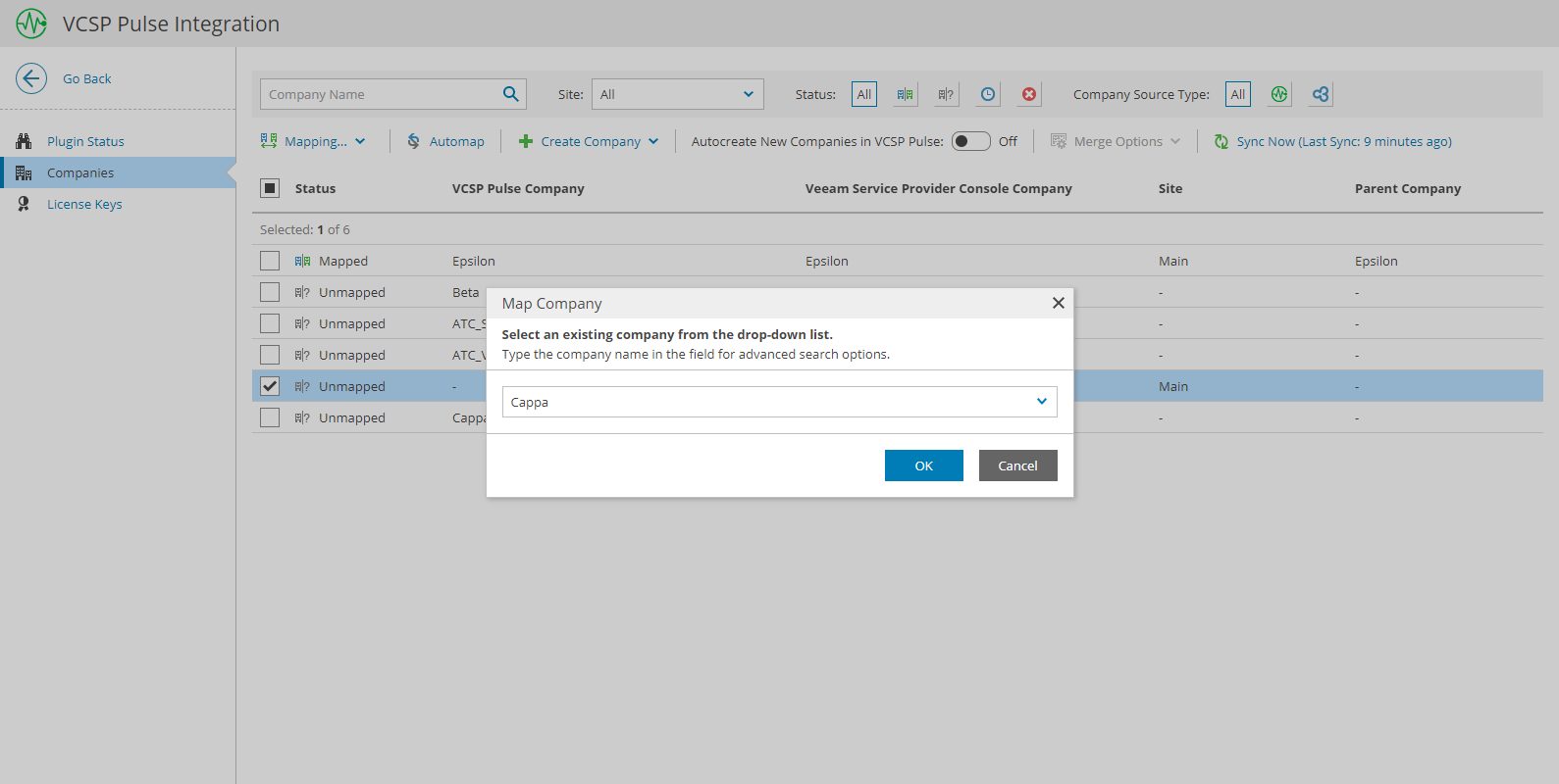 This will automatically detect companies in VCSP Pulse with the names same or similar to the names of companies configured in Veeam Service Provider Console.