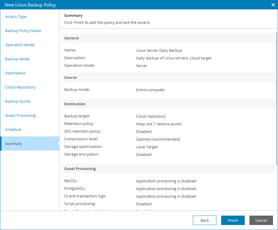 This is an archive version of the document. To get the most up-to-date information, see the current version. Step 18. Review Backup Policy Settings At the Summary step of the wizard, review settings of the configured backup policy and click Finish.