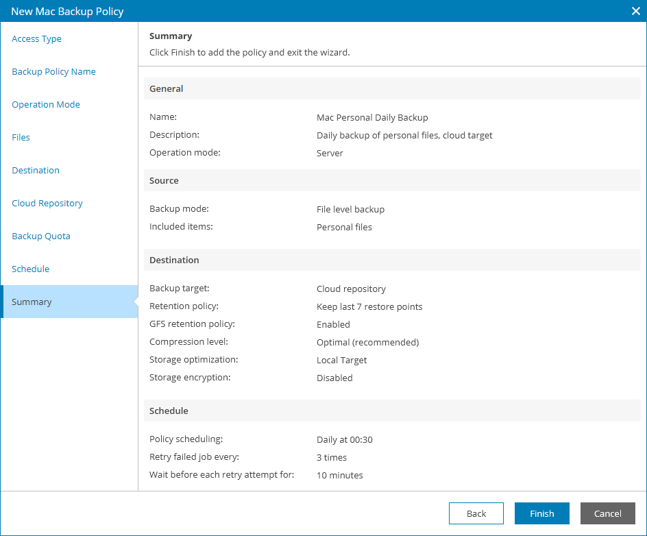 This is an archive version of the document. To get the most up-to-date information, see the current version. Step 15. Review Backup Job Settings At the Summary step of the wizard, review settings of the configured backup policy and click Finish.