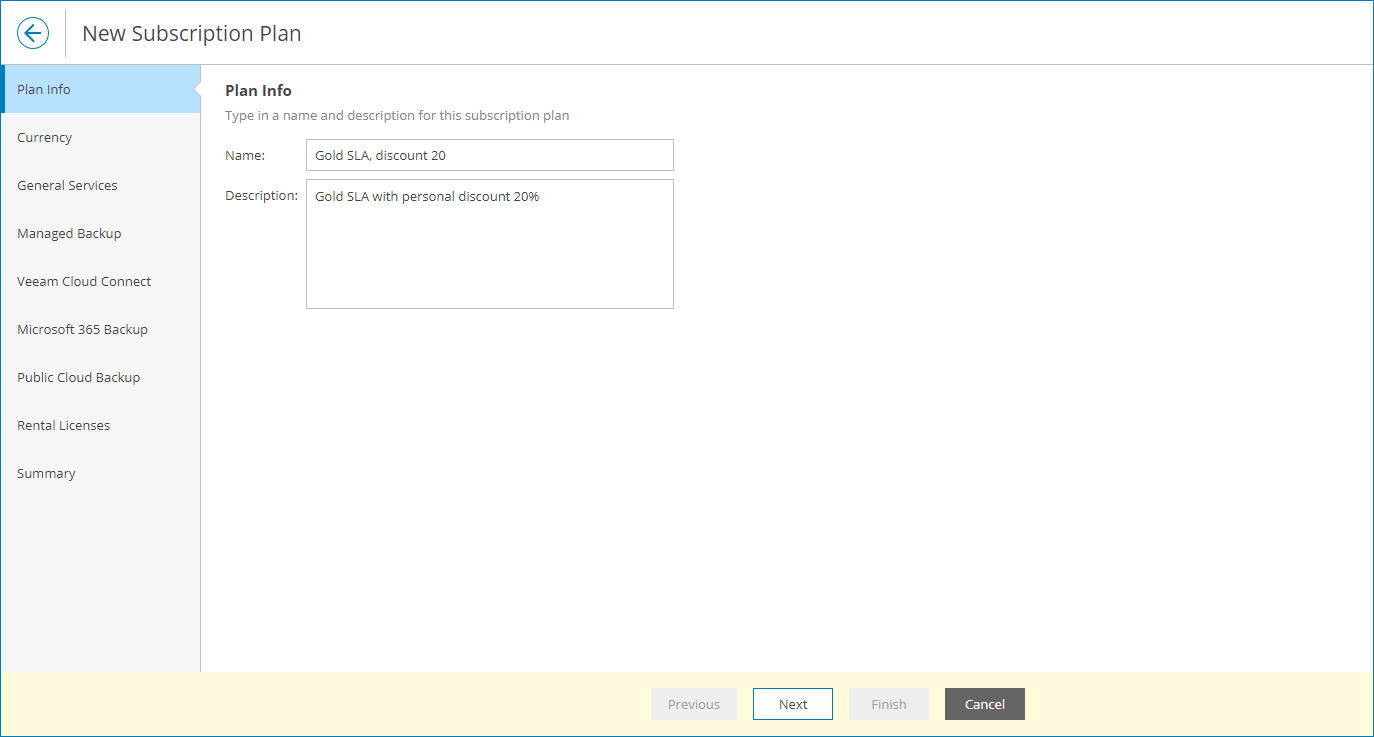 This is an archive version of the document. To get the most up-to-date information, see the current version. Step 2. Specify Subscription Plan Name and Description At the Plan Info step of the wizard, specify a name and description of a new subscription plan.