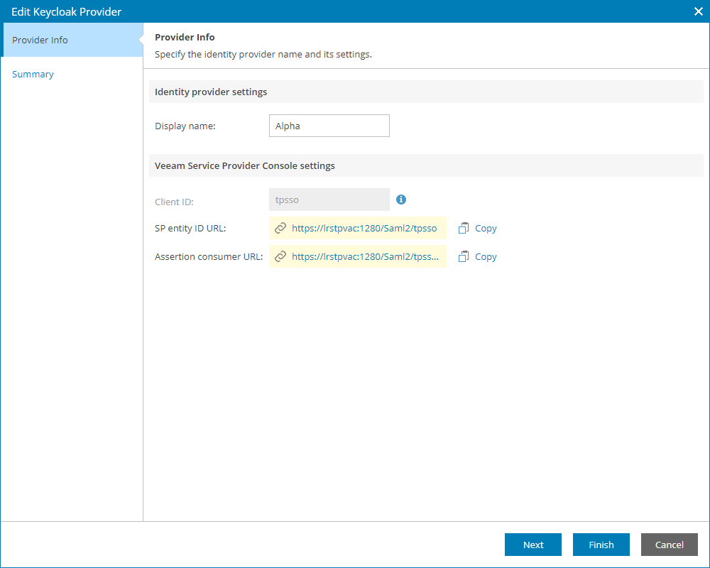 SAML authentication requires SP to set up trust relationship with IdP. To do that in Veeam Service Provider Console, you must create an IdP configuration: